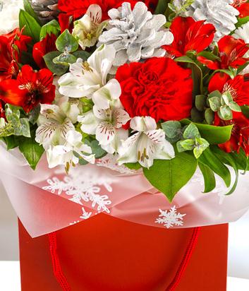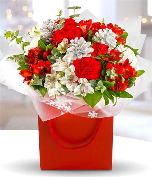 Make someone's Christmas extra special this year with this exquisite Christmas gift bag Bouquet of red and white Alstroemeria and Carnations.