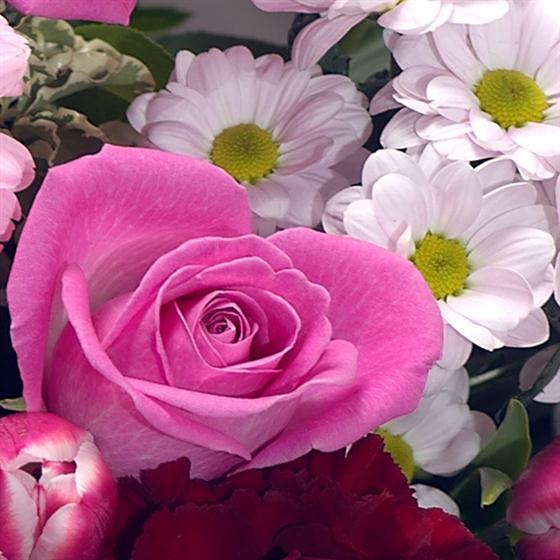 An exquisitely designed Valentine's bouquet. Delicate soft pink Germini and Carnations are neatly nestled alongside beautiful pink Tulips and Roses. Deep velvet red Carnations and Germini perfect the splendour of this bouquet.