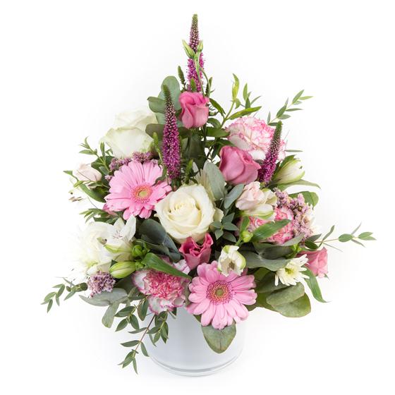 A delightful arrangement in pastel pinks and creams, including roses, veronica, mini gerberas and eucalyptus.