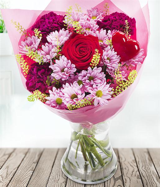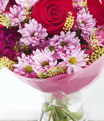 A fantastically romantic aquapack of mixed reds, pinks and burgundy. Red roses are the star of this show, supported by chrysanthemums and carnations.